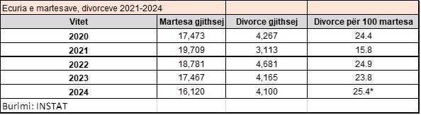 Të dhënat zyrtare të INSTAT tregojnë se vitin e kaluar kishte 16,120 martesa me rënie -7.7% në krahasim me 2023, ndërsa divorcet ishin 4,100 ose 65 më pak se në 2023.