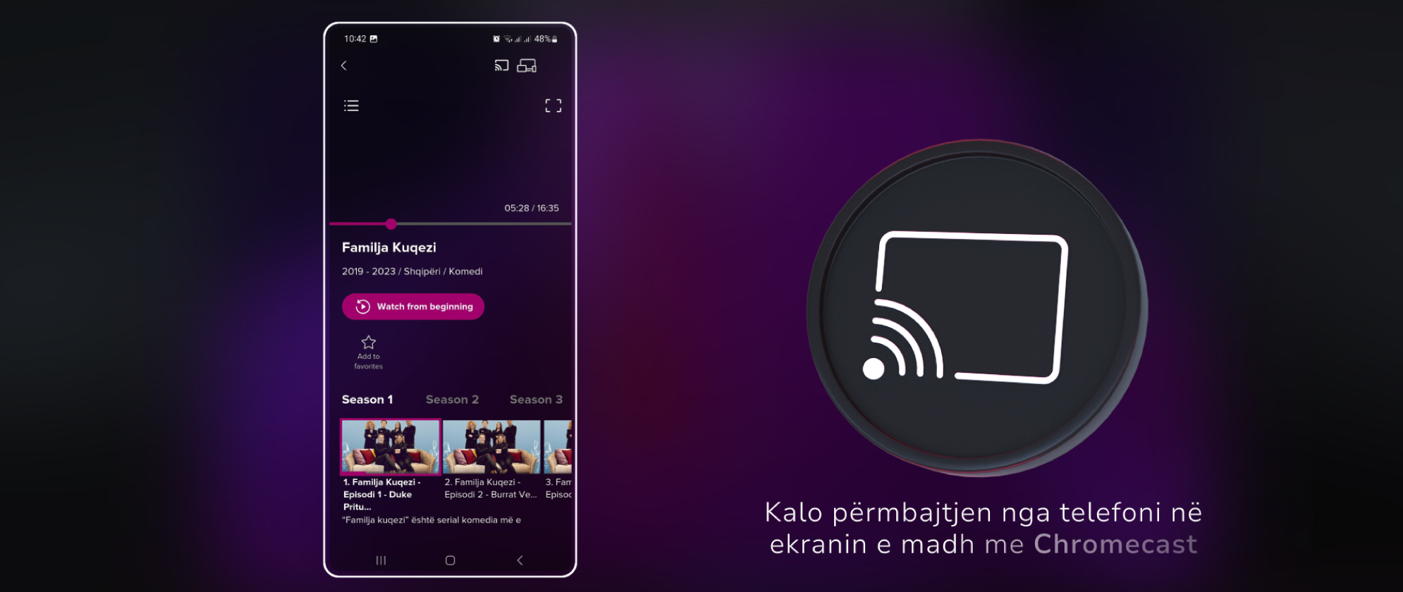Je duke shijuar programin tënd të preferuar në telefon ose tablet dhe do ta shohësh në ekranin e madh. Me mbështetjen e Chromecast, brenda një çasti dhe pa ndërprerje, e kalon shikimin në TV.
