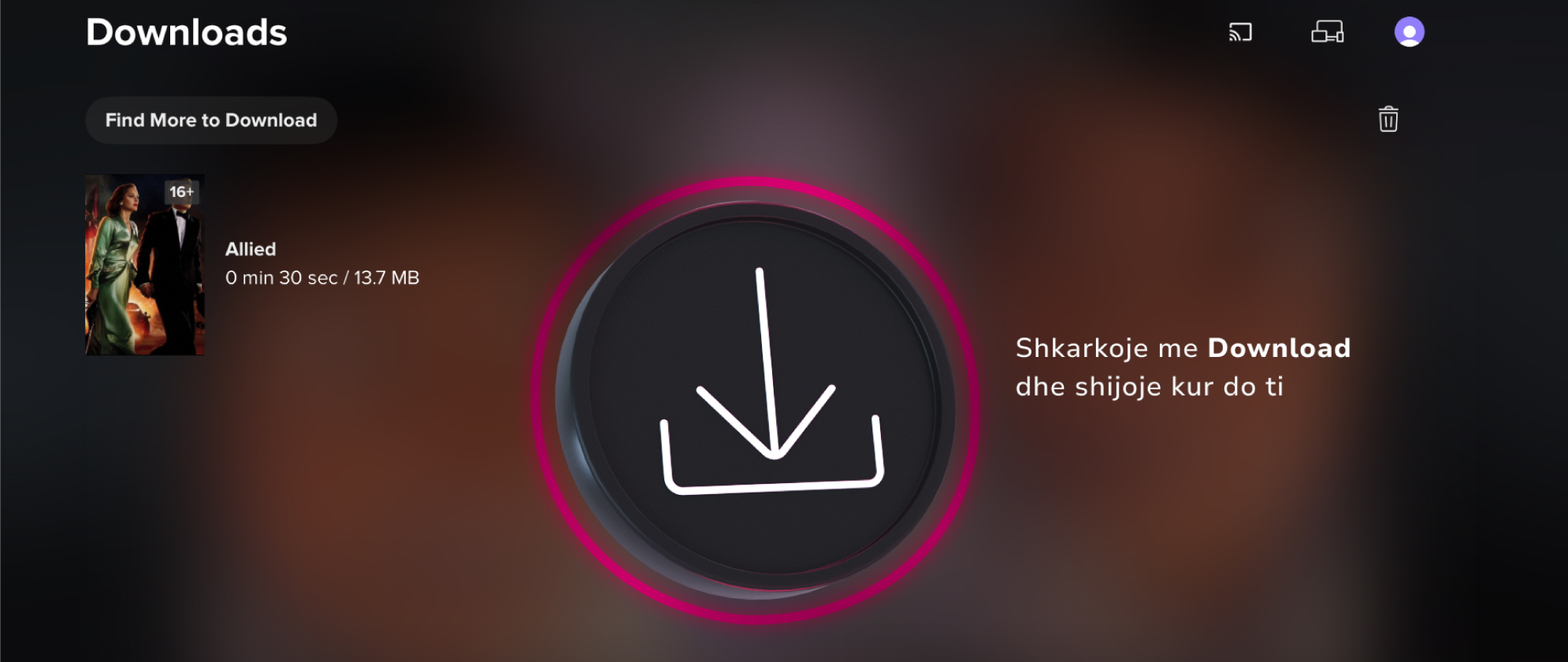 Përmbajtja që do nuk të ndjek vetëm kur je online. Shkarko filmat dhe serialet e preferuara dhe shijoje kudo, në çdo moment, edhe pa lidhje interneti.