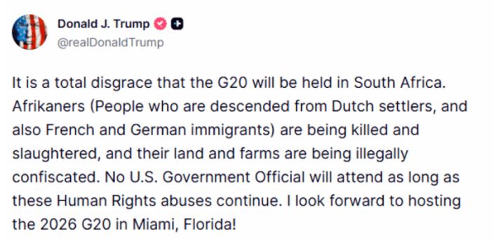 “Është një skandal që G20 po mbahet në Afrikën e Jugut. Afrikanerët (njerëz që rrjedhin nga kolonët holandezë dhe gjithashtu nga emigrantët francezë dhe gjermanë) po vriten dhe masakrohen, dhe toka dhe fermat e tyre po konfiskohen ilegalisht. Asnjë zyrtar i qeverisë amerikane nuk do të marrë pjesë për sa kohë që këto abuzime me të drejtat e njeriut vazhdojnë”, shkroi Trump në Truth Social.