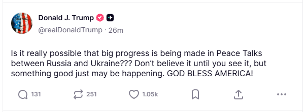 Në një mesazh të shkurtër në Truth Social, ai shkroi: "A është vërtet e mundur që të ketë shumë përparim në bisedimet e paqes midis Rusisë dhe Ukrainës??? Mos e besoni derisa ta shihni, por ndoshta diçka e mirë po ndodh."