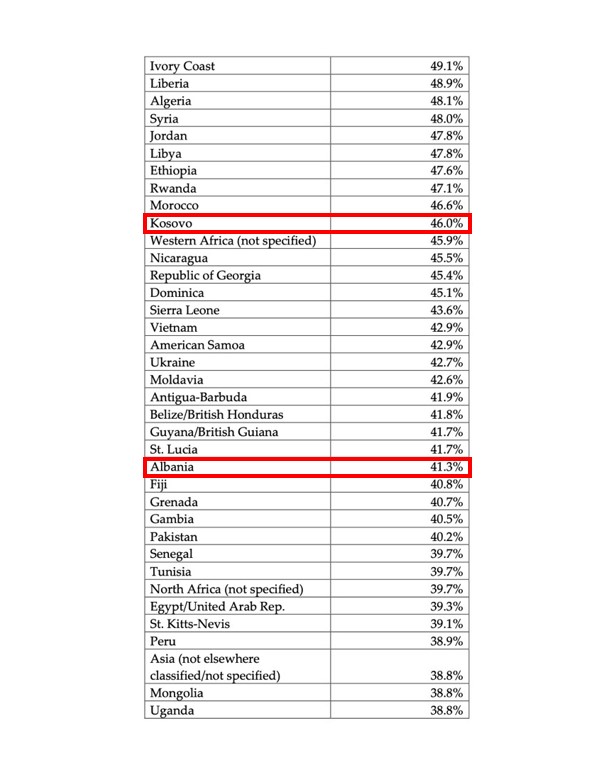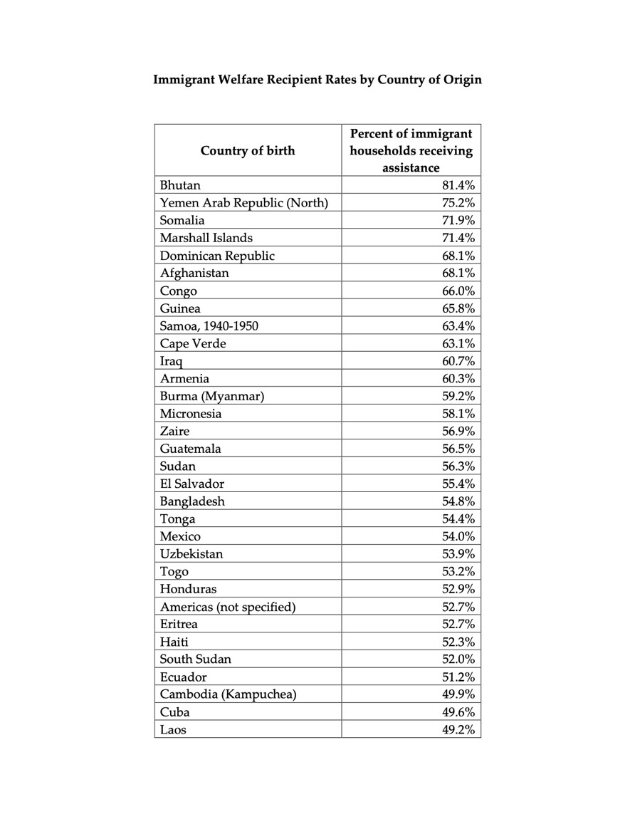 Tabelat janë pjesë e një renditjeje me titull “Immigrant Welfare Recipient Rates by Country of Origin”, ku paraqitet përqindja e familjeve emigrante që marrin asistencë sociale, të ndara sipas vendit të origjinës. Në listën e publikuar nga Trump, Shqipëria rezulton me një përqindje më të ulët krahasuar me Kosovën apo vende të tjera, por mbi pragun 40%, duke u renditur pranë shteteve si Moldavia, Ukraina dhe Vietnami.