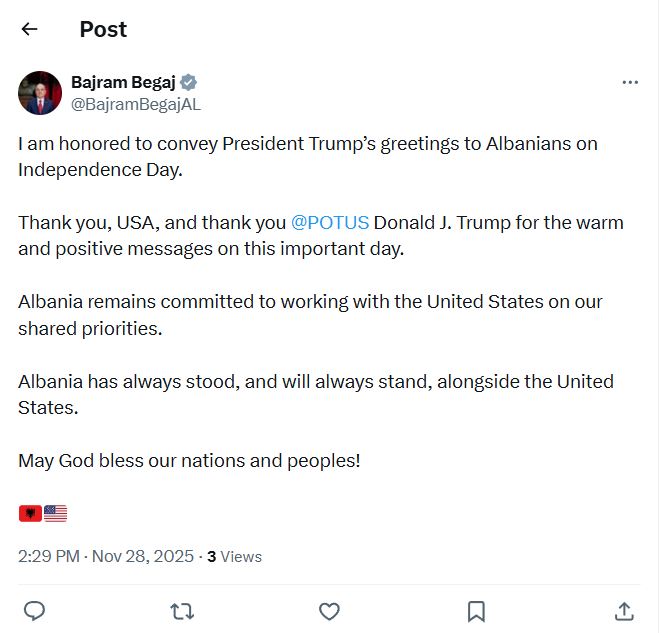"Jam i nderuar të përcjell përshëndetjet e Presidentit Trump për shqiptarët në Ditën e Pavarësisë. Faleminderit, SHBA, dhe faleminderit Donald J. Trump për mesazhet e ngrohta dhe pozitive në këtë ditë të rëndësishme. Shqipëria mbetet e përkushtuar për të punuar me Shtetet e Bashkuara mbi prioritetet tona të përbashkëta. Shqipëria ka qëndruar gjithmonë, dhe do të qëndrojë gjithmonë, krah Shteteve të Bashkuara. Zoti i bekoftë kombet dhe popujt tanë!", ka shkruar presidenti Begaj.