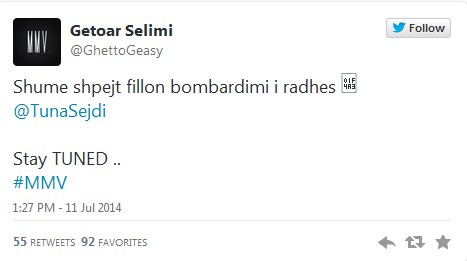 “Shumë shpejt fillon bombardimi i radhës”,-ka qenë statusi në rrjete sociale i këngëtarit Getoar Selimi në Tëitter duke iu referuar bashkëpunimit me Tunën, i cili pritet të publikohet së shpejti.