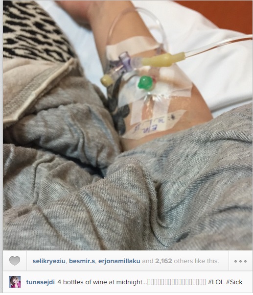“4 shishe verë në mesnatë, e sëmurë”, -ka shkruar këngëtarja krahas fotos në gjuhën angleze.