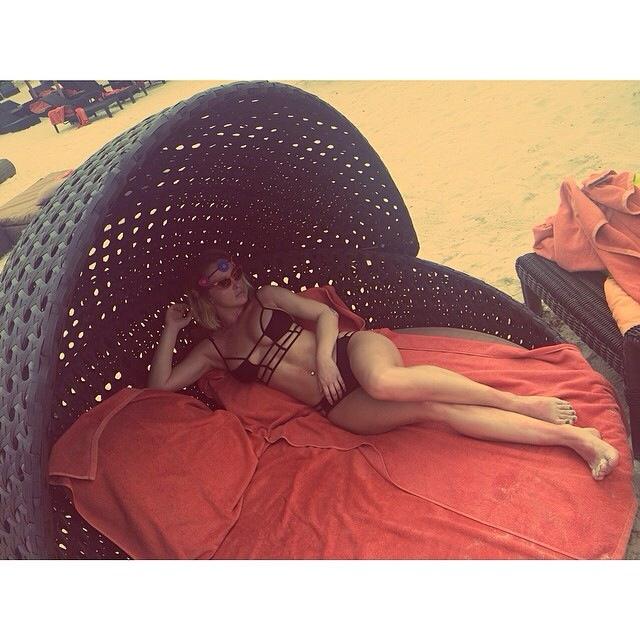 E shtrirë në plazh duke marë rreze, ajo ka treguar format seksi me një palë bikini në ngjyrë të zezë.