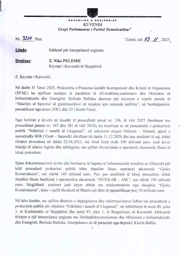 PD kërkon interpelancë urgjente në Kuvend me zëvendës kryeministren Belinda Ballluku, pasi u mor e pandehur nga SPAK për shkelje të barazisë në tenderin për ndërtimin e tunelit të Llogarasë. Në shkresën e firmosur nga 7 deputetë, kërkohet që zv. kryeministrja, njkëherësh ministre e Infrastrukturës dhe Energjisë, të japë shpjegime lidhur me procedurën e prokurimit publik.