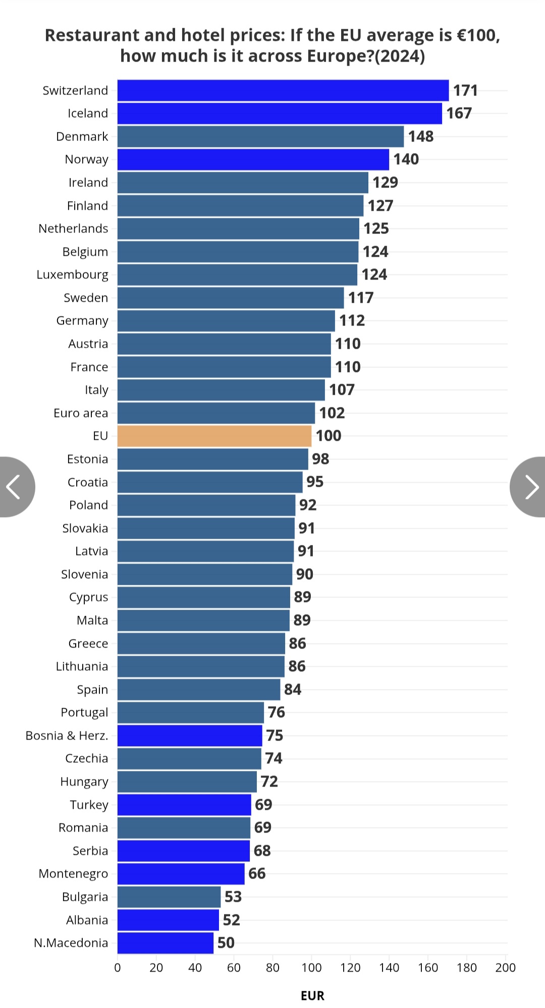 Për ata që duan të krahasojnë kostot mes vendeve, treguesi i nivelit të çmimeve i Eurostat-it për restorantet dhe hotelet mund të jetë i dobishëm.