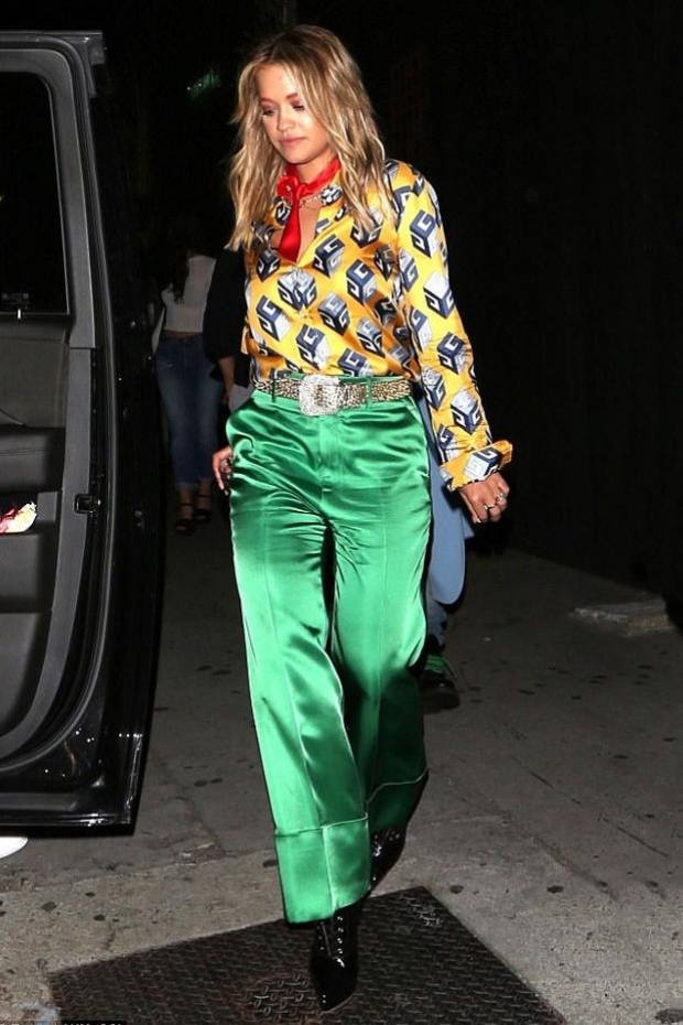 Me një këmishë Gucci ngjyrë ari me simbolin G në të gjithë sipërfaqen e saj dhe një palë pantallona të gjelbra Rita Ora ka tërhequr vëmendjen e të gjithëve.