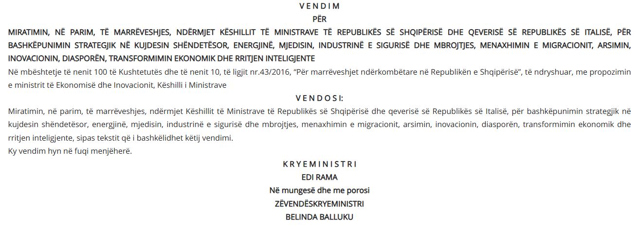 Në mbledhjen e sotme qeveria miratoi në parim marrëveshjen ndërmjet Qeverisë së Republikës së Shqipërisë dhe Qeverisë së Republikës së Italisë për bashkëpunim strategjik në fushat:
