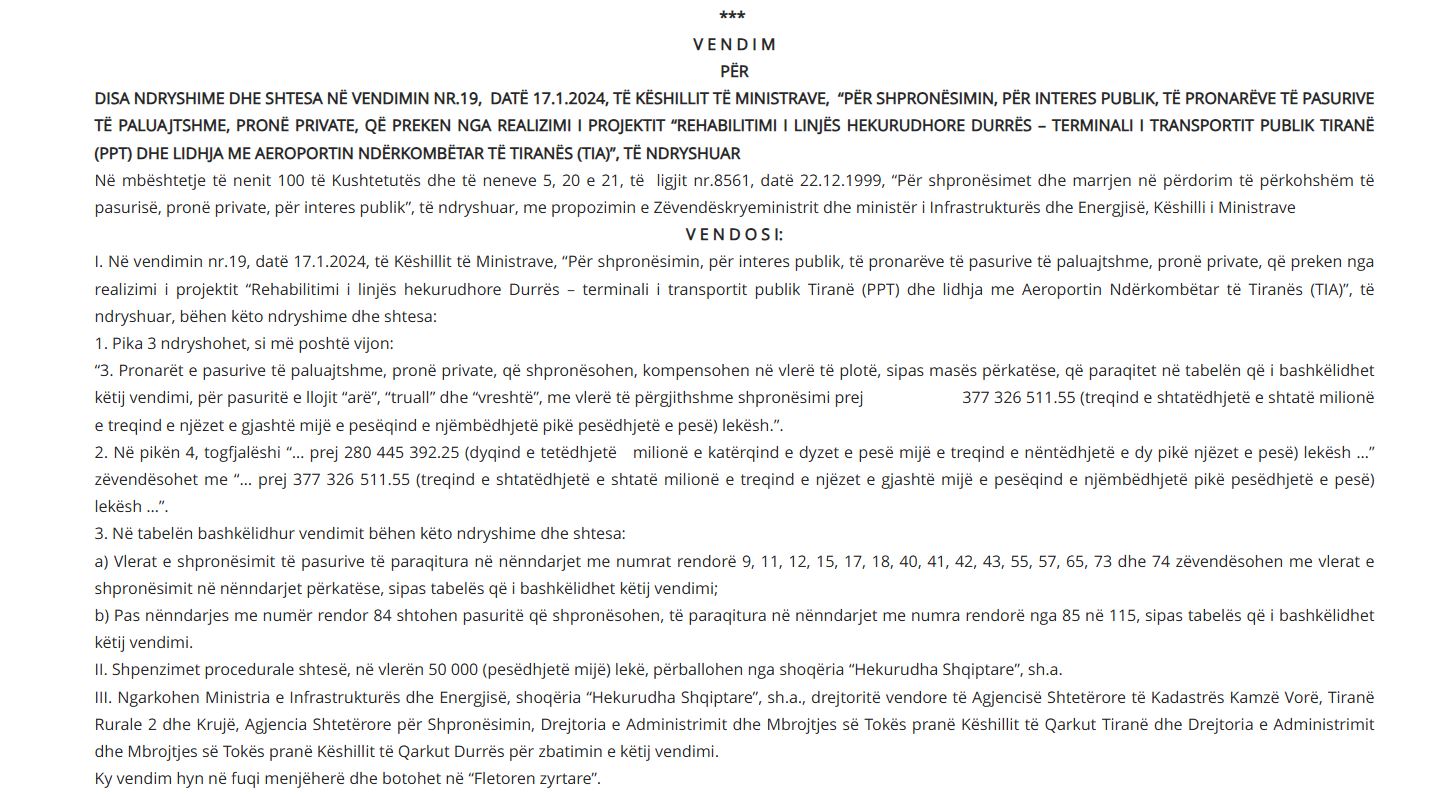 Sipas vendimit të ri, fondi total i shpronësimeve rritet në 377.3 milionë lekë, nga rreth 280.4 milionë lekë që ishte parashikuar më parë. Ndryshimet përfshijnë rishikimin e vlerave të kompensimit për disa pasuri ekzistuese, si dhe shtimin e pasurive të reja që do të shpronësohen.