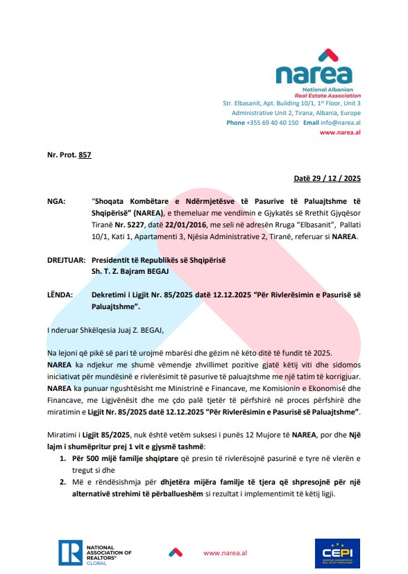 Shoqata Kombëtare e Ndërmjetësve të Pasurive të Paluajtshme të Shqipërisë (NAREA) i është drejtuar Presidentit të Republikës, Bajram Begaj, me një kërkesë zyrtare për dekretimin sa më të shpejtë të Ligjit nr. 85/2025 “Për Rivlerësimin e Pasurisë së Paluajtshme”, të miratuar më 12 dhjetor 2025.