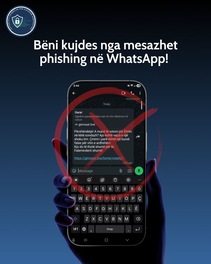 Drejtoria për Hetimin e Krimit Kibernetik informon qytetarët se këto mesazhet synojnë marrjen e kontrollit të llogarisë në aplikacionin “WhatsApp”, duke i drejtuar përdoruesit drejt faqeve të rreme dhe duke i nxitur të vendosin kode verifikimi, të cilat përdoren nga autorët për të përvetësuar llogarinë.