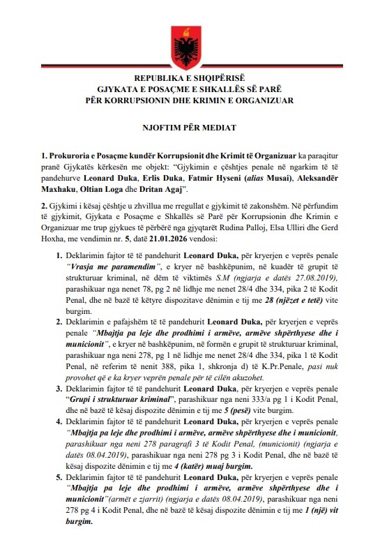 Me 30 vite burg u dënua Leonard Duka, një prej emrave më të përbetuar në armiqësi me Ervis Martinajn, si organizator dhe porositës i vrasjes gjakftohtë. Duka u arrestua në shkurt 2024 në Belgjikë dhe në gusht të atij viti u ekstradua në drejtim të Tiranës për t’u përballur me drejtësinë. Gjykata e Posaçme dha dënim edhe për Fatmir Hysenin, Aleksadër Maxhakun, Dritan Agën dhe Oltion Lonën, pjesë e grupit të vrasjes, 25 vjet burg për secilin. I vetmi që mundi të marrë pafajësi ishte vëllai i Leonard Dukës, Elvis Duka, për të cilin SPAK nuk mundi të gjejë prova për implikimin e tij në atentat.