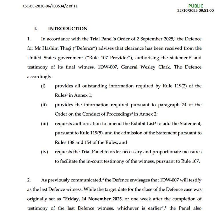 "Në përputhje me Urdhrin e Dhomës së Gjykimit të datës 2 shtator 2025, mbrojtja e z. Hashim Thaçi njofton se ka marrë autorizimin nga qeveria e Shteteve të Bashkuara të Amerikës që lejon dhënien e deklaratës dhe dëshmisë së dëshmitarit të saj të fundit, 1DW-007, gjeneral Wesley Clark.", thuhet në shkresën e avokatëve të Thaçit.