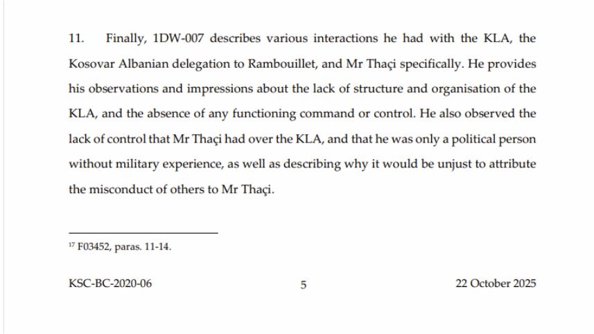 “Së fundmi, 1DË-007 përshkruan ndërveprimet e ndryshme që ai pati me UÇK-në, delegacionin e shqiptarëve të Kosovës në Rambuje dhe konkretisht me z. Thaçi. Ai jep vëzhgimet dhe përshtypjet e tij në lidhje me mungesën e strukturës dhe organizimit të UÇK-së, dhe mungesën e çdo komande ose kontrolli funksional. Ai gjithashtu vëzhgoi mungesën e kontrollit që z. Thaçi kishte mbi UÇK-në, dhe se ai ishte vetëm një person politik pa përvojë ushtarake, si dhe përshkruan pse do të ishte e padrejtë t’i atribuohej sjelljes së keqe të të tjerëve z. Thaçi.”, thuhet në dokumentin e mbrojtjes.