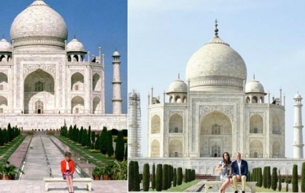 Duka dhe Dukesha e Kembrixhit, janë fotografuar së bahsku të ulur në një stol përpara pallatit Taj Mahal në Indi. Në të njëjtin stol, 24 vite më parë ishte ulur princesha e Uellsit, Diana.