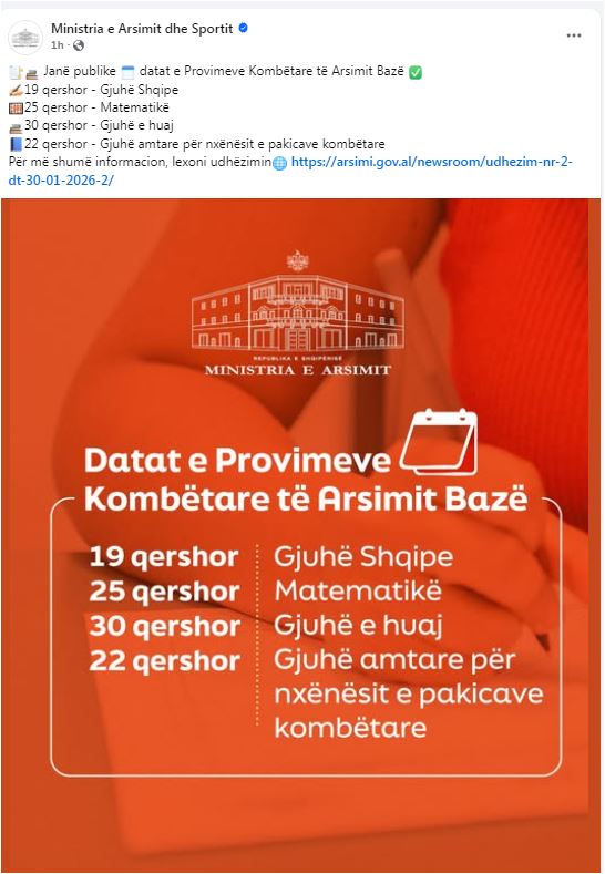 Postimi i Ministrisë së Arsimit dhe Sportit në Facebook