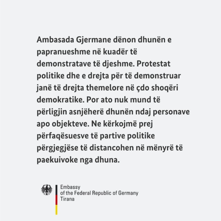 “Ambasada Gjermane dënon dhunën e papranueshme në kuadër të demonstratave të djeshme. Protestat politike dhe e drejta për të demonstruar janë të drejta themelore në çdo shoqëri demokratike. Por ato nuk mund të përligjin asnjëherë dhunën ndaj personave apo objekteve. Ne kërkojmë prej përfaqësuesve të partive politike përgjegjëse të distancohen në mënyrë të paekuivoke nga dhuna”, thuhet në reagimin e Ambasadës.