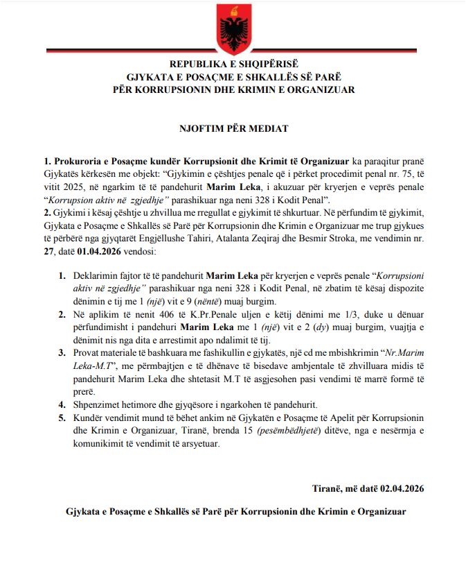 2. Gjykimi i kësaj ҫështje u zhvillua me rregullat e gjykimit të shkurtuar. Në përfundim të gjykimit, Gjykata e Posaçme e Shkallës së Parë për Korrupsionin dhe Krimin e Organizuar me trup gjykues të përbërë nga gjyqtarët Engjëllushe Tahiri, Atalanta Zeqiraj dhe Besmir Stroka, me vendimin nr. 27, datë 01.04.2026 vendosi: