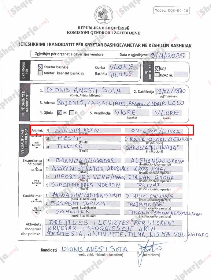 Kandidati që mbështetet nga PD e Berishës, në formularin që ka depozituar në KQZ ka deklaruar se niveli më i lartë i arsimit të tij është “arsim i mesëm”, ndërkohë që në hapësirën ku do duhej të shënonte emrin e universitetit ku ka kryer studimet e larta, Sota ka shkruar “studim aktiv on-line/libra”, pa specifikuar ndonjë institucion universitar apo program konkret studimi.