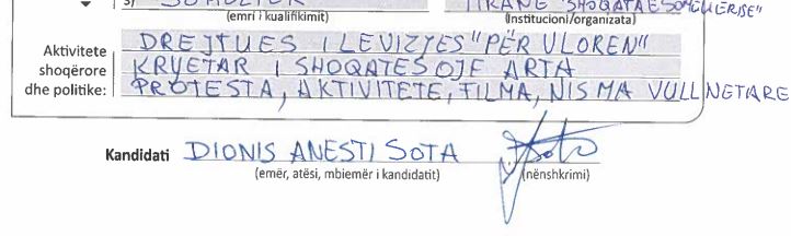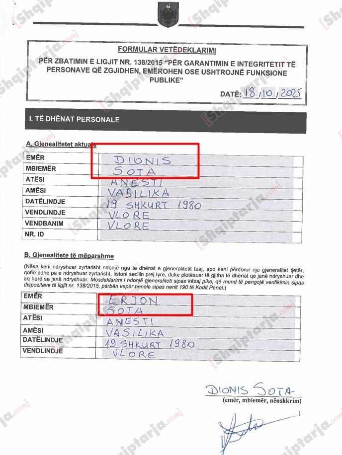 Ndërkohë, ajo çfarë ngre edhe më shumë pikëpyetje është një tjetër detaj në formularin e vetëdeklarimit, ku Sota pranon se më herët ai ka përdorur një tjetër emër. Sipas të dhënave të plotësuara, të dyja emrat lidhen me të njëjtin person, i lindur më 19 shkurt 1980 në Vlorë, me prindërit Anesti dhe Vasilika Sota. Kandidati opozitar shkruan se ka përdorur edhe emrin Erjon Sota. Ligjërisht, ky fakt nuk përbën pengesë për kandidim, por mund të jetë indicie për KQZ që ta dërgojë në prokurori për verifikim të thelluar.