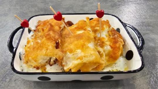 Gjethe lakre të skuqura mbushur me djathë nga zonja Albana