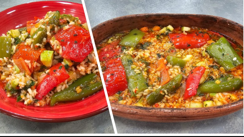 Tavë me speca dhe orizPërbërësit:800 gr speca200 gr oriz1 qepë e thatë2 kunguj1 karotë3 lgj salcë domate1 Iç kripë1 Ik piper i zi